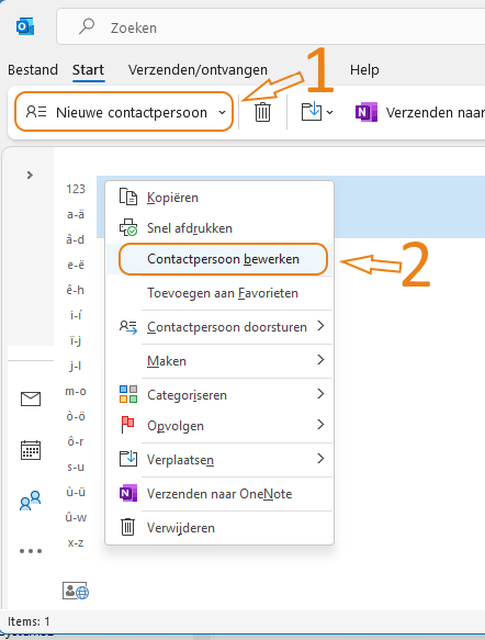 Klik op Nieuwe contactpersoon (1) om een nieuw contactpersoon aan te maken of klik met de rechter muisknop op een bestaand contact om deze te bewerken (2)