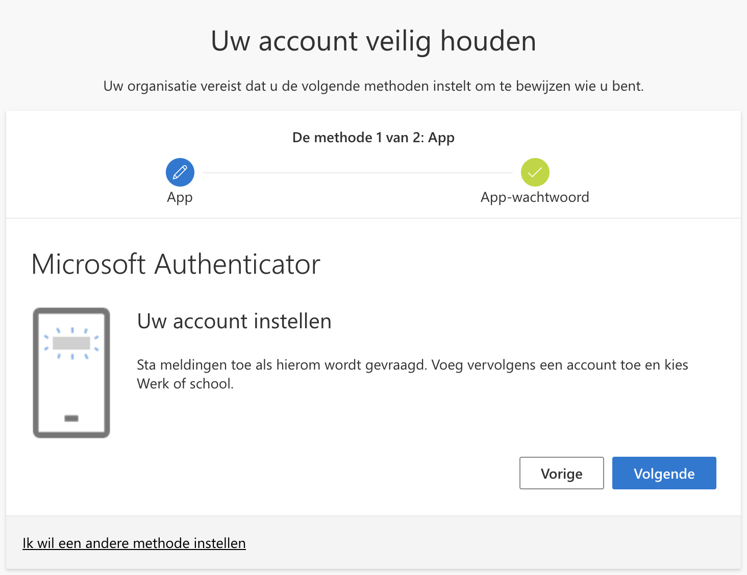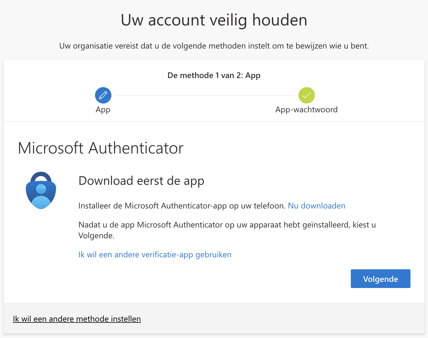 Download vervogens de Microsoft Authenticator app als deze niet al op de telefoon is geinstalleerd. Klik vervolgens op Volgende.