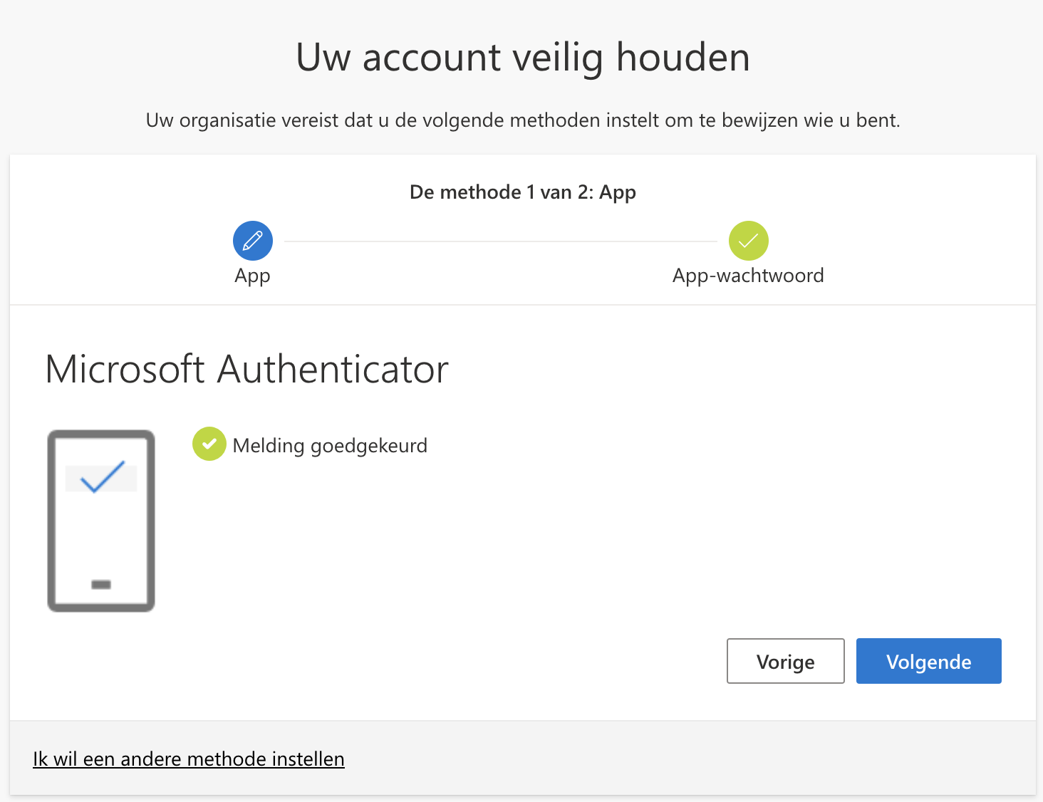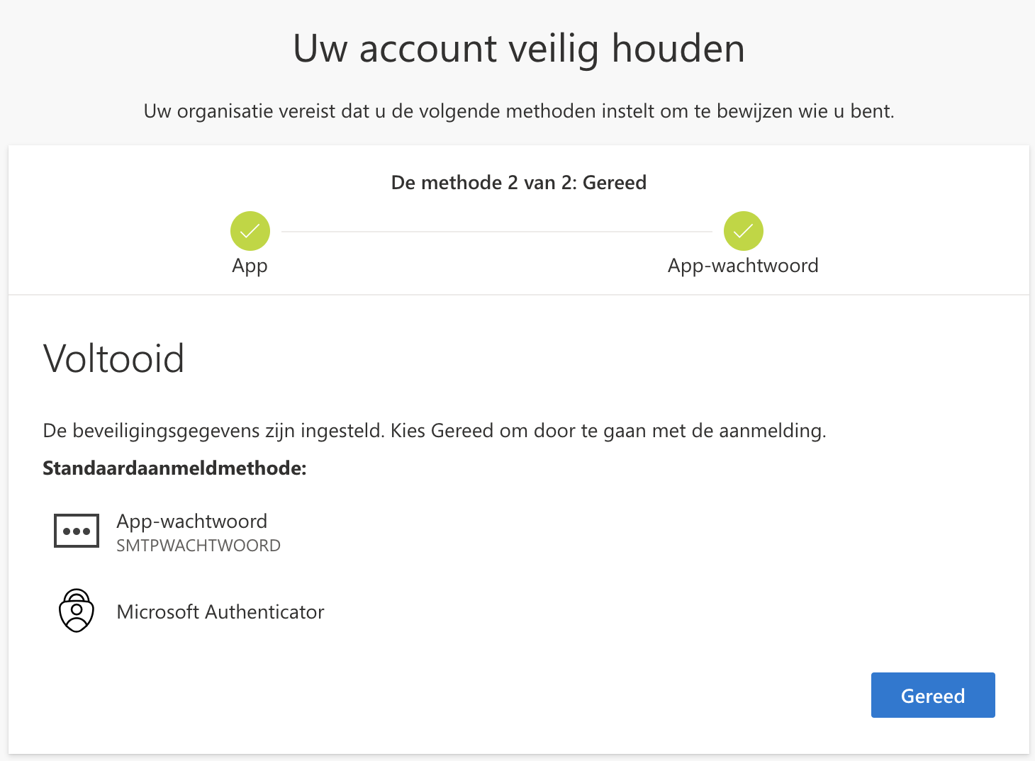 Multi-factor authenticatie is nu ingesteld. Er kan nu van MFA gebruik worden gemaakt bij het inloggen.