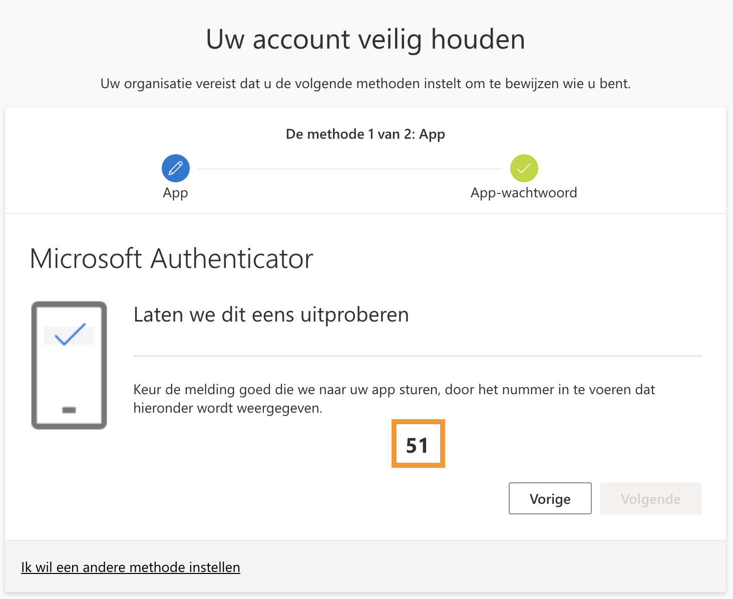 We kunnen nu proberen of het werkt om de setup af te ronden. Er verscheint op de computer een code, die in de Microsoft Authenticator app op de telefoon overgetypt moet worden. Klik na het overtypen op Volgende.
