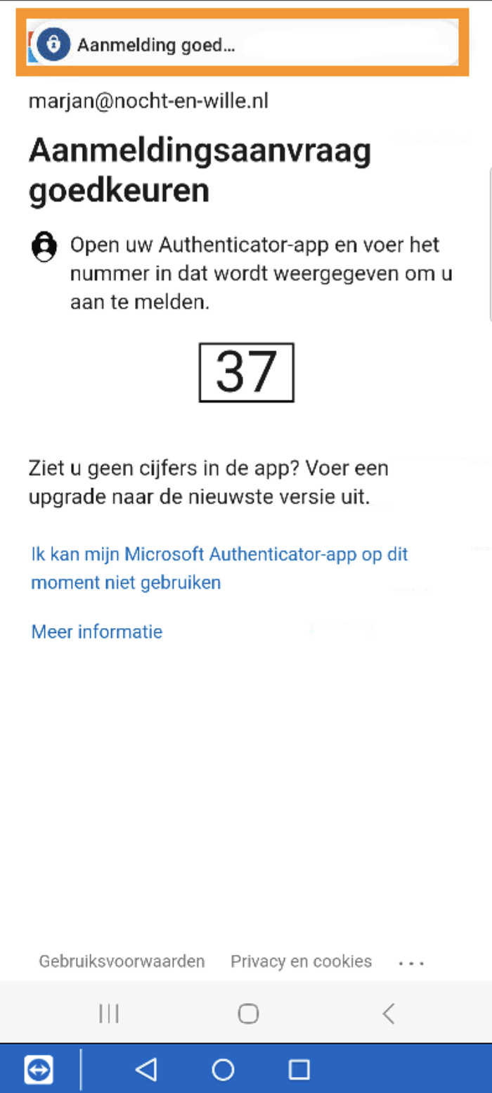 Er verschijnt vervolgens een code in het scherm. Onthoud deze code (in dit voorbeeld 37) en open de Microsoft Authenticator app door boven in op de push melding te klikken.