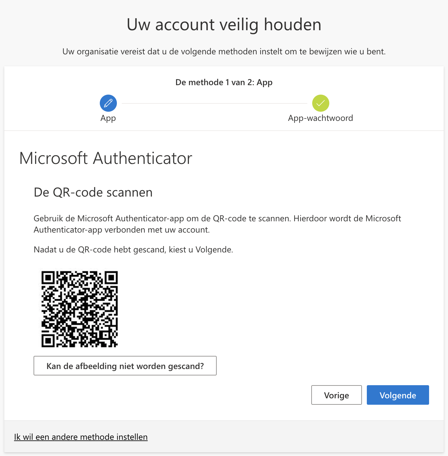 Er is nu een QR code zichtbaar op het scherm. Deze is zo nodig om in de mobiele telefoon de code toe te voegen aan de Microsoft Authenticator app.