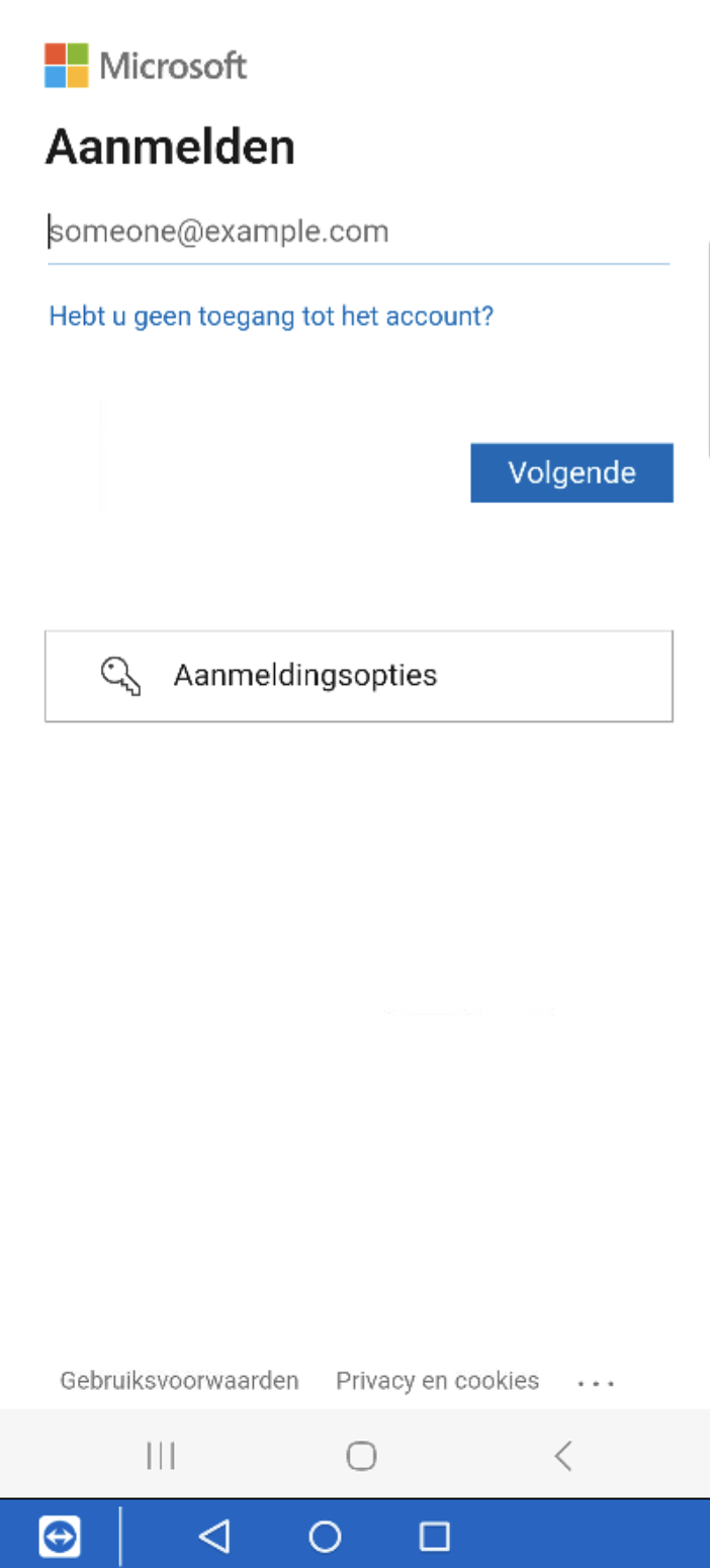 Vul het e-mailadres in. Dit is het zelfde account dat wordt gebruikt voor e-mail en werkplekken.