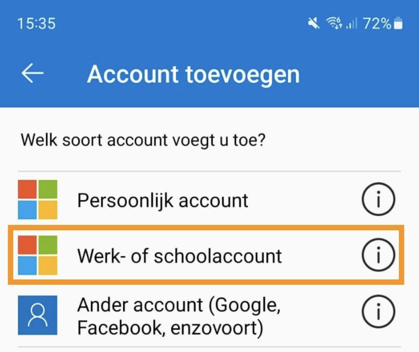 Klik op Werk- of schoolaccount om een nieuw account toe te voegen.