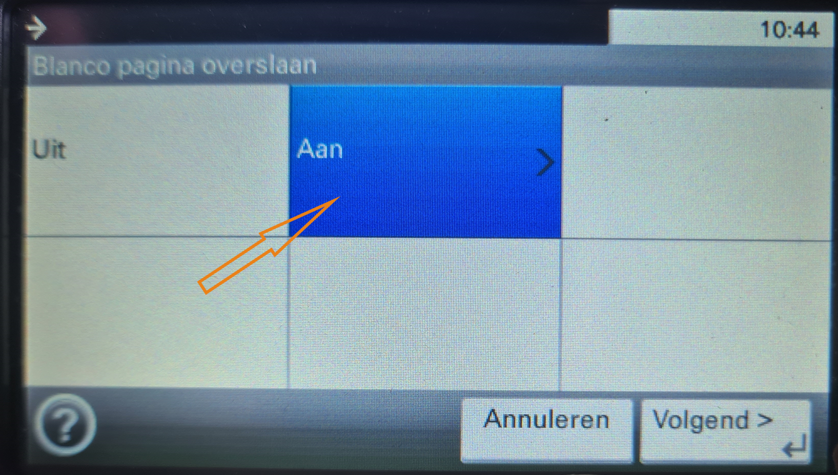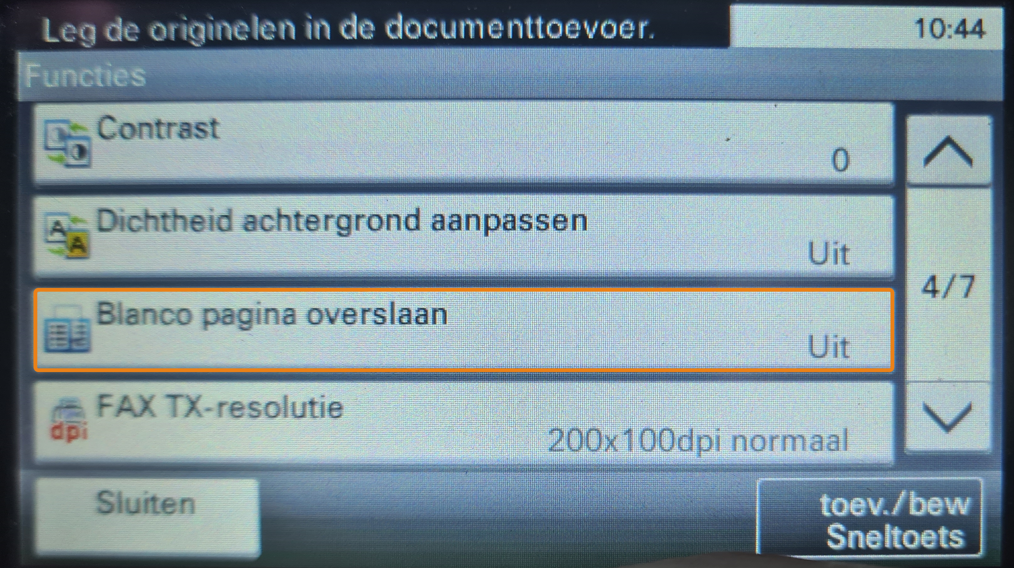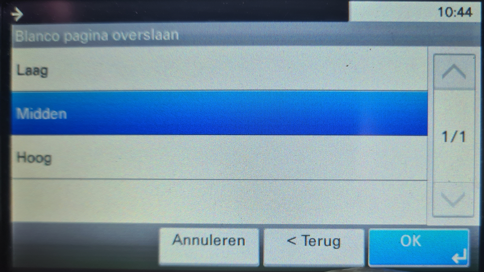 Kies vervolgens één van de opties (Laag, Midden of Hoog. Indien ingesteld op Hoog, is het niveau waarop blanco papier wordt herkend hoger) en bevestig met OK