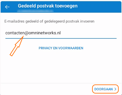 Geef bij E-mailadres “postvak@uwdomein.nl” (bijvoorbeeld: contacten@omninetworks.nl) in en tik op doorgaan